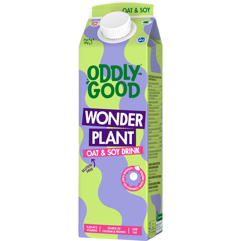 Kun yhdistetään kauran lempeä maku ja soijan proteiinipitoisuus, syntyy todellinen kasvipohjainen superyhdistelmä! Oddlygood® Wonder Plant kaura-soijajuoma on sekoitus kauraa ja soijaa. Se on vegaaninen ja gluteeniton, maultaan pehmeä ja raikkaan herkullinen. Ja kaiken hyvän lisäksi proteiinin lähde. Siis kenties täydellinen kasvipohjainen juoma! Siemaise sellaisenaan, surauta smoothieksi, tee puurosta entistä parempaa tai taio ihanin tuorepuuro. Tuotteeseen on lisätty kalsiumia, jodia ja vitamiineja (D2, riboflaviini (B2), B12). Ravista ennen käyttöä. Valmistetaan Suomessa.