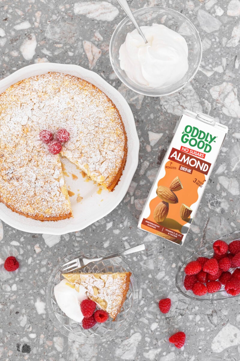 This plant-based almond cake is tender, fragrant, and beautifully simple to make. A blend of almond flour, Oddlygood® Almond Drink, and a hint of lemon creates a moist, delicate crumb with subtle citrus notes. Topped with crunchy flaked almonds and baked to golden perfection, it’s a comforting treat for any time of day.