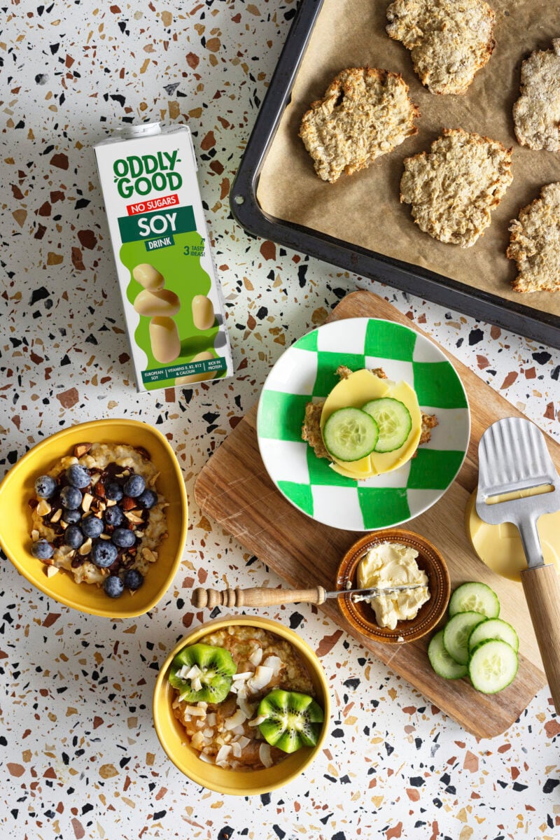 Start your day with a warm, hearty and filling bowl of porridge! Make it extra creamy and filling by using soy drink as the liquid. Next day (or the same if you’re extra hungry), you’ll have another warm, hearty and filling breakfast containing of flatbreads made with the same batch of porridge.