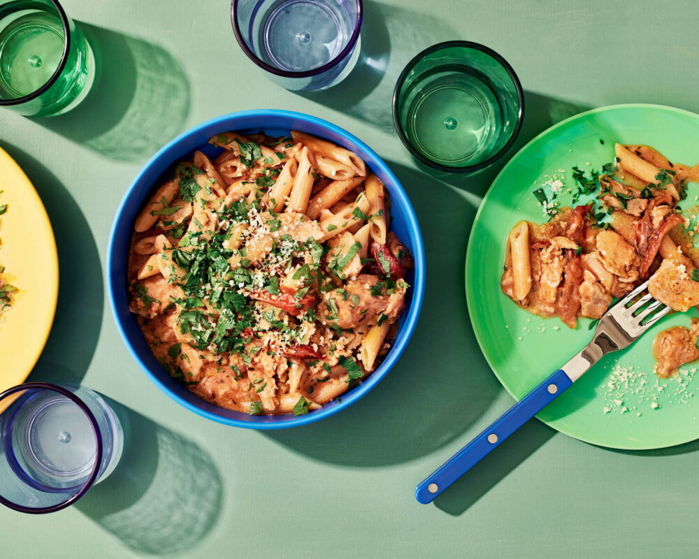 - Sekoita joukkoon pasta. Anna kypsyä hiljaa poreillen noin 15 minuuttia, kunnes pasta on kypsää. Viimeistele annokset yrtillä ja raasteella.