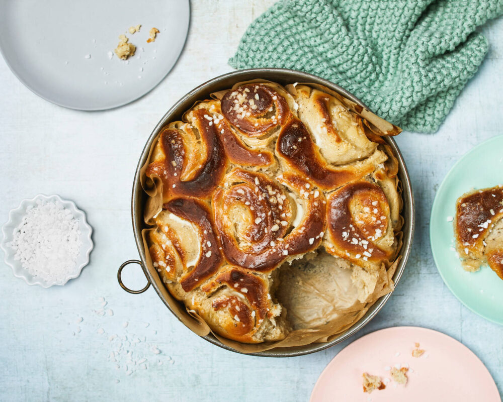 - Kauli kohonneesta taikinasta suorakaiteen muotoinen levy. Levitä sille täytettä. Kääri taikinalevy rullaksi. Jätä saumakohta alapuolelle. Leikkaa rulla terävällä veitsellä n. 8 viipaleeksi. Laita viipaleet kakkuvuokaan. Kohota liinan alla.