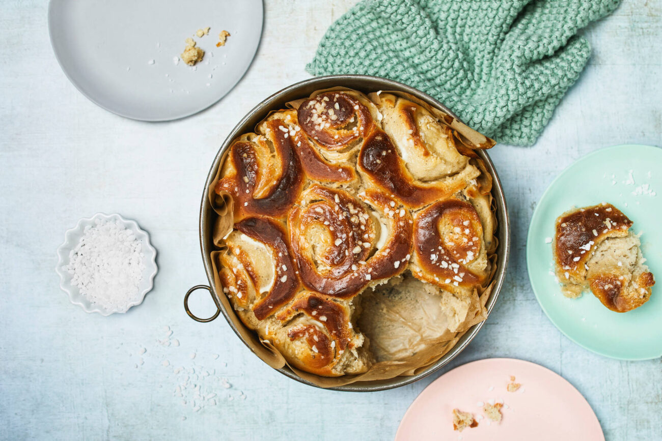 - Kauli kohonneesta taikinasta suorakaiteen muotoinen levy. Levitä sille täytettä. Kääri taikinalevy rullaksi. Jätä saumakohta alapuolelle. Leikkaa rulla terävällä veitsellä n. 8 viipaleeksi. Laita viipaleet kakkuvuokaan. Kohota liinan alla.