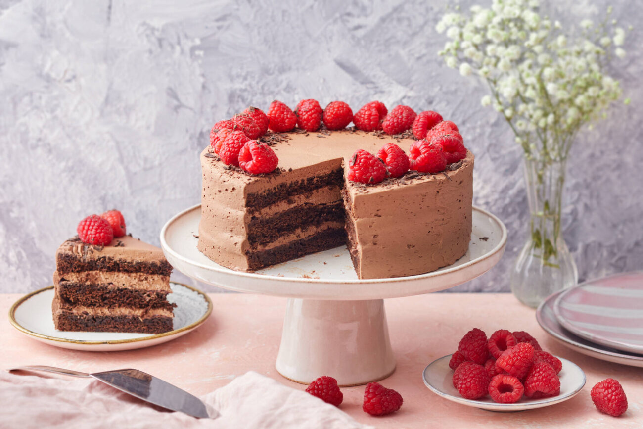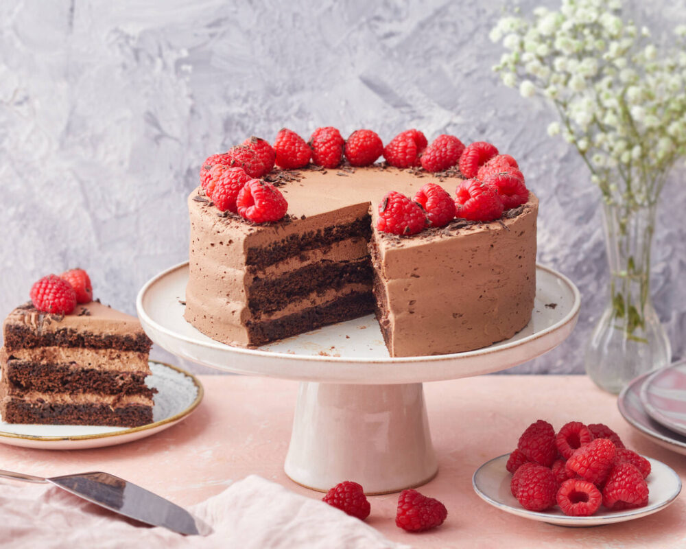 - Käytä loput suklaavaahdosta kakun kuorruttamiseen. Koristele tuoreilla vadelmilla ja suklaarouheella. Anna kakun tekeytyä muutama tunti ennen tarjoilua.