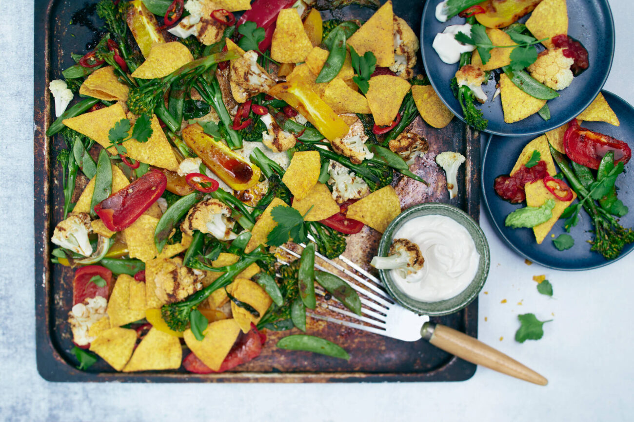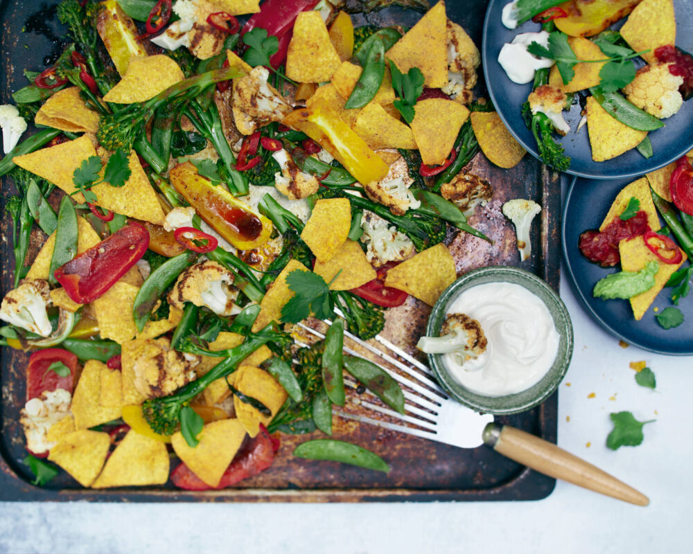- Ota pelti pois uunista ja viimeistele pinta nacholastuilla, salsalla, guacamolella, Dream Fraichella ja tuoreella korianterilla.