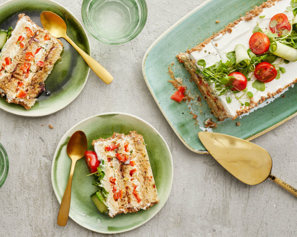 - Kokoa voileipäkakku kelmun päällä. Asettele 3 vaaleaa paahtoleipää pohjaksi. Kostuta ja levitä päälle puolet tofu-tomaattitäytteestä ja puolet marinoiduista punasipuleista.