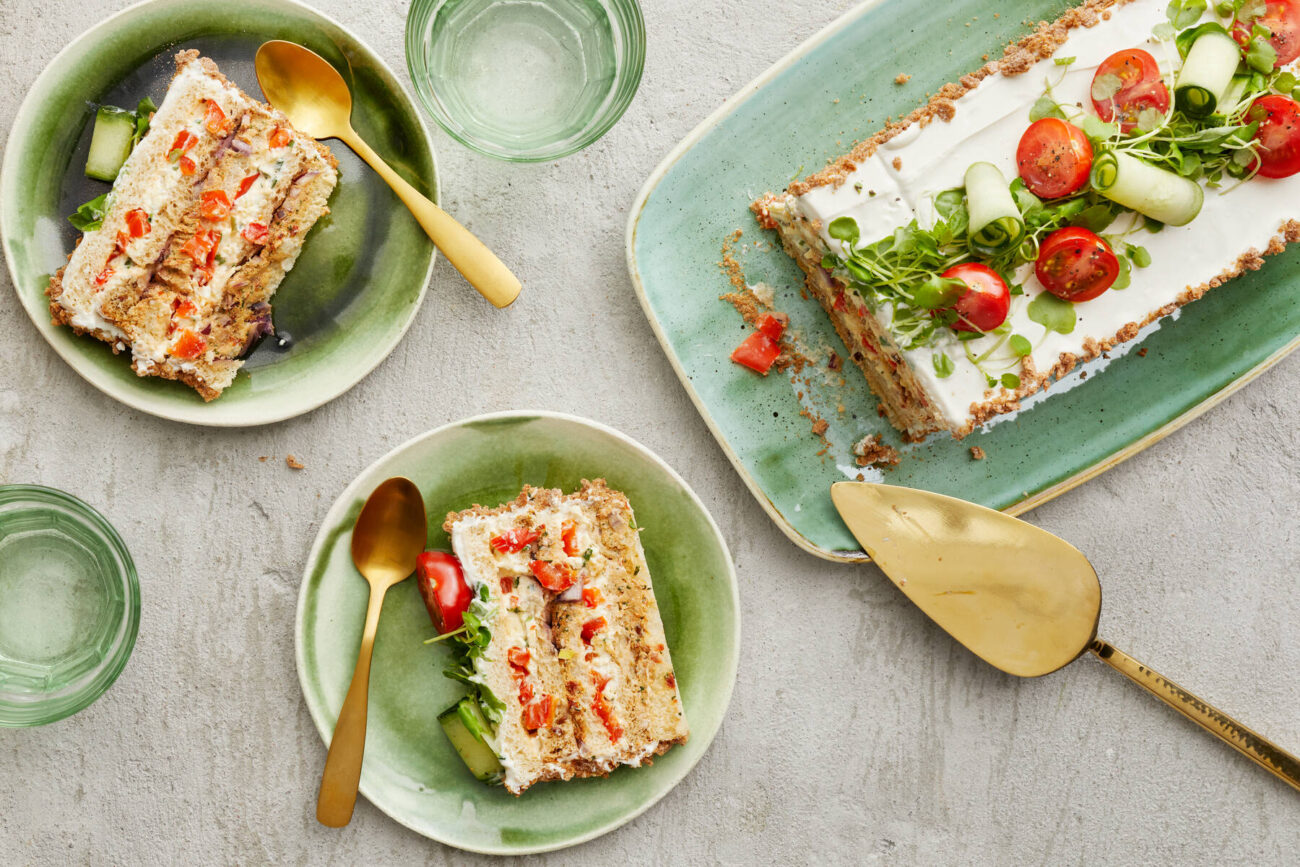 - Aseta 3 tummaa paahtoleipää täytteiden päälle. Kostuta ja levitä päälle puolet Veggie-täytteestä ja puolet paahdetuista paprikoista.